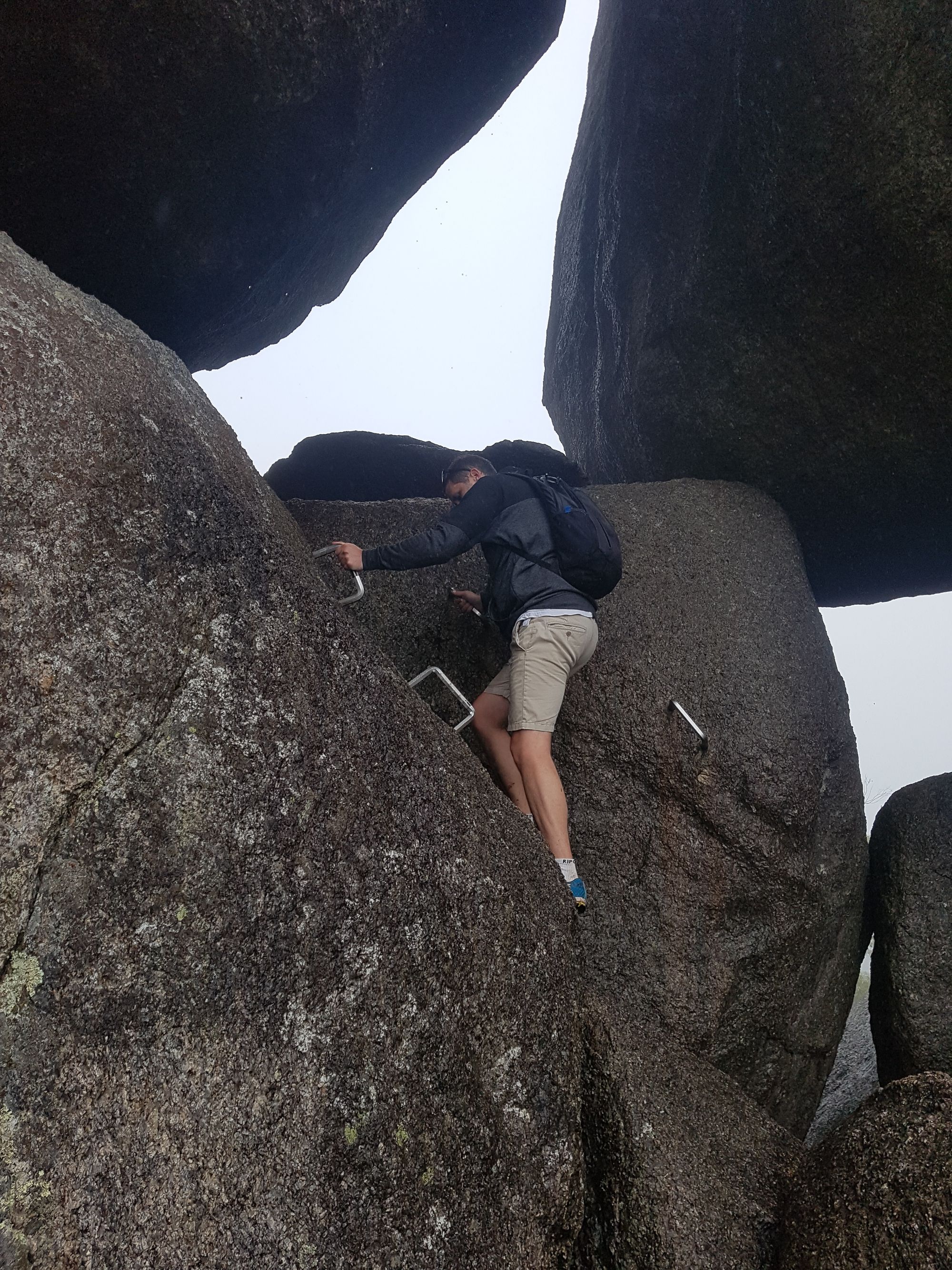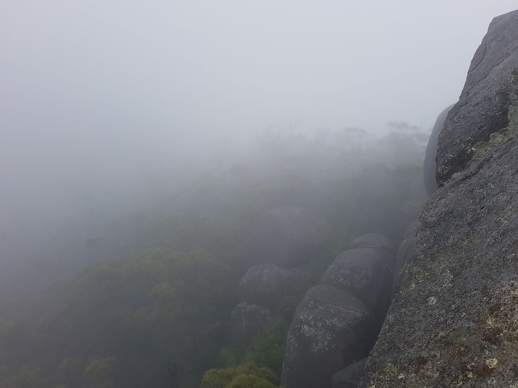The weather had turned to crap, and upon arriving at the Granite Skywalk at the Porongurup National Park we were quite glad that we had climbed Bluff Knoll the day before. The Porongurups are a range of eroded granitic domes – similar to the You Yangs near Lara in Victoria. Granite Skywalk in the clouds. At Castle rock there is a section of trail called the Granite Skywalk, the trail itself is 4.4km in length and enclosed in thick Karri and Marri forest. The skywalk itself is a suspended walkway built around the granite outcrop. There is a six-metre ladder and some rock scrambling to get around and we did it all in the clouds and drizzle (would not recommend the latter).