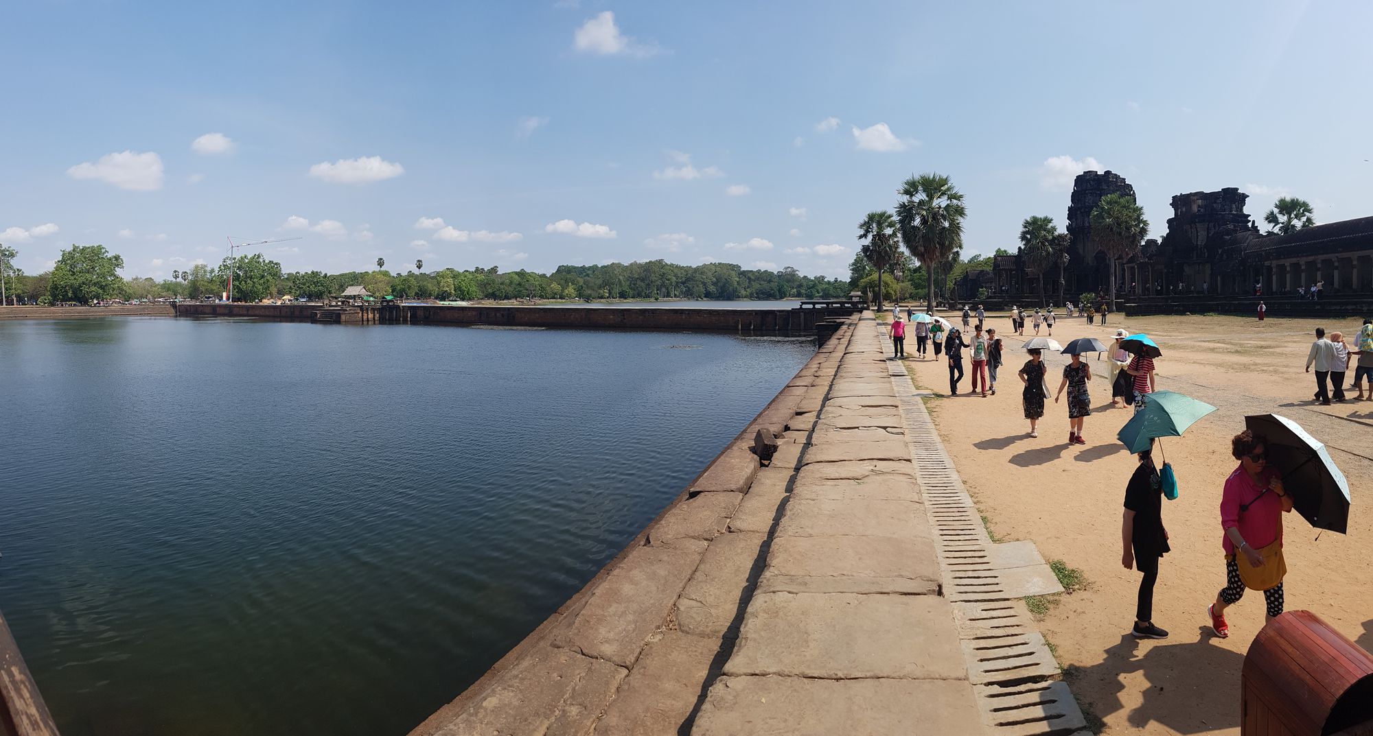 The city of Angkor Thom is enclosed on each side by a wall of which is about three kilometers (1.9 miles) long made of laterite 8 meters (26 feet) in height around the city encloses an are of 145.8 hectares (360 acres). A moat with a width of 100meters (328 feet) surrounds the outer wall. An entry tower and along causeway bisect each side of the wall except on the east where are two entrances. The additional one, called the "Gate of Victory "is aligned with the causeway leading to the Terraces of the Elephants and the Leper King. A small temple known as "Prasat Chrung' stands at each corner of the wall around the city of Angkor Thom.