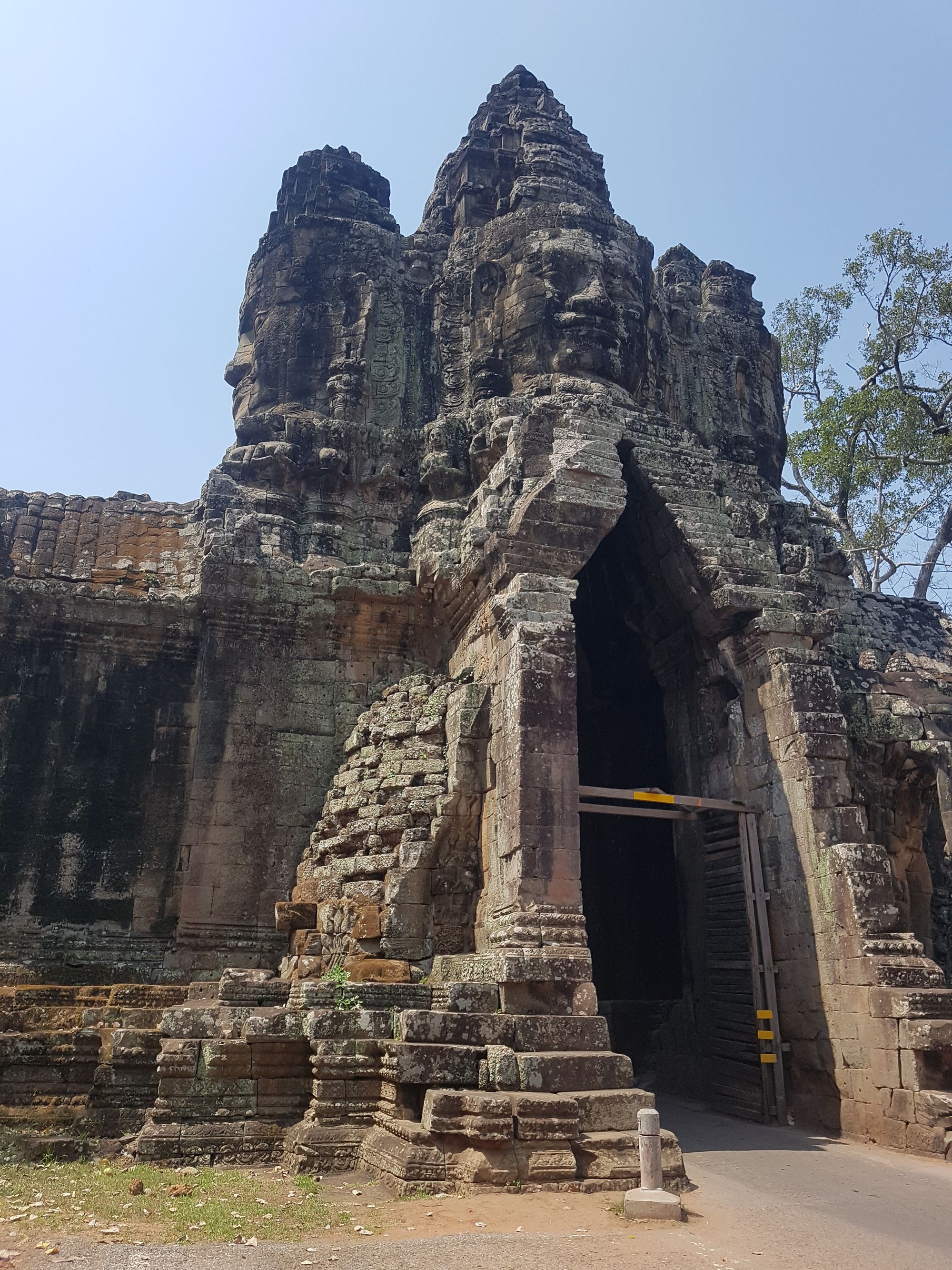 Each of the entry points to Angkor Thom consist of the gate and a long causeway leading to each entry tower is flanked by a row of 54 stone figures on each side – demons on the right and gods on the left-to make a total of 108 mythical beings guarding the city of Angkor Thom. The demons have a grimacing expression and wear a military headdress whereas the gods look serene with their almond-shaped eyes and wear a conical headdress. (Some of the heads on these figures are copies; the original ones have been removed and are at the Angkor Conservancy in Siem Reap) or were ransacked during the Pol Pot regime to trade and sell off to gain wealth to Cambodia (this was part of the undermining of the religion, culture and identity of the Cambodian people).