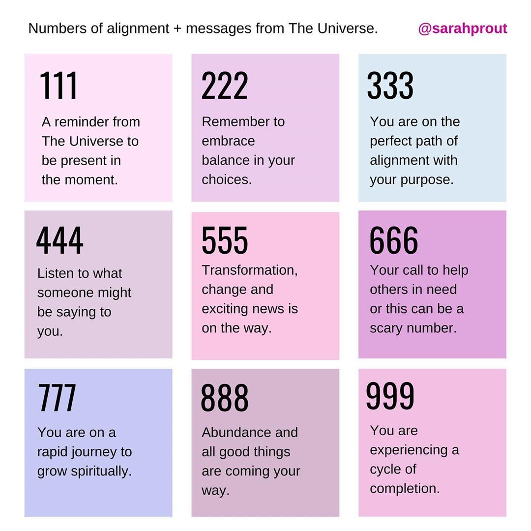 Seeing a certain pattern or sequence of numbers such as on license plates, or coming across the same number or number patterns such as in an address or phone number, or seeing the time 11:11, 2:22, 3:33, 12:34, etc., can all have hidden meanings. For instance, if you’re seeing repeating numbers such as 1111, 333, 444, 555, etc. those are all signs from the universe that you’re on the right path. Each number sequence can also have more specific meanings if you analyze what the numbers mean in numerology. You can also see random numbers that mean something special to you like your favourite number, lucky number or your birthday. I personally, regardless of if morning or late evening always manage to check the clock or my phone at 11:11, even if at night I’d been previously asleep I can randomly awake at this time. And I love the number 7, it shows up for me in positive moments more often than not.